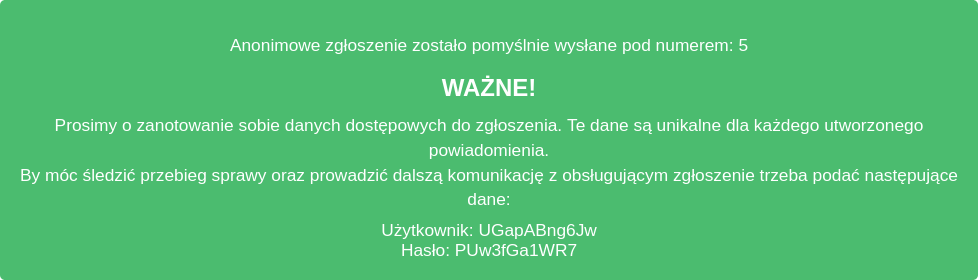 - Dane logowania zapisz w bezpiecznym miejscu, są one konieczne by uzyskać dostęp do zgłoszenia. Więcej w następnym rozdziale.