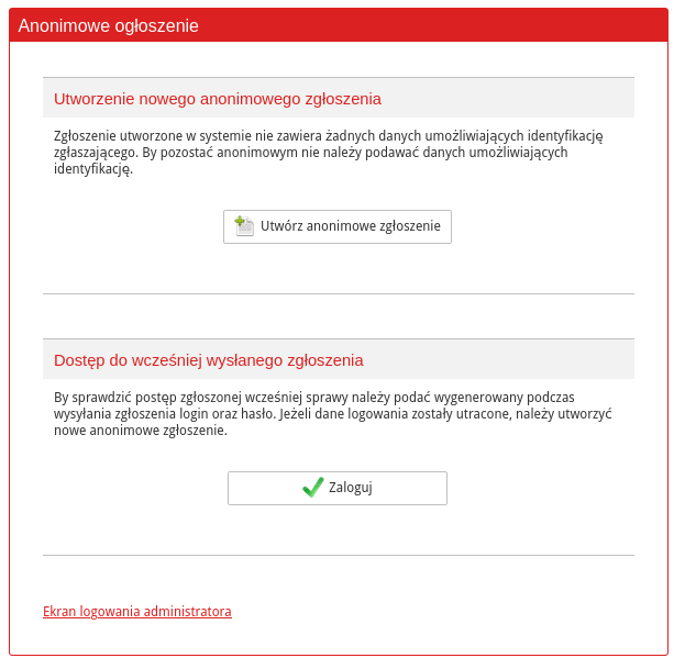 - Na ekranie logowania kliknij na przycisk Utwórz anonimowe zgłoszenie