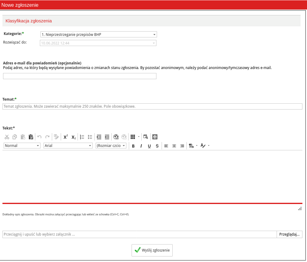 - Zgłoszenie wyślesz za pomocą przycisku Wyślij zgłoszenie.